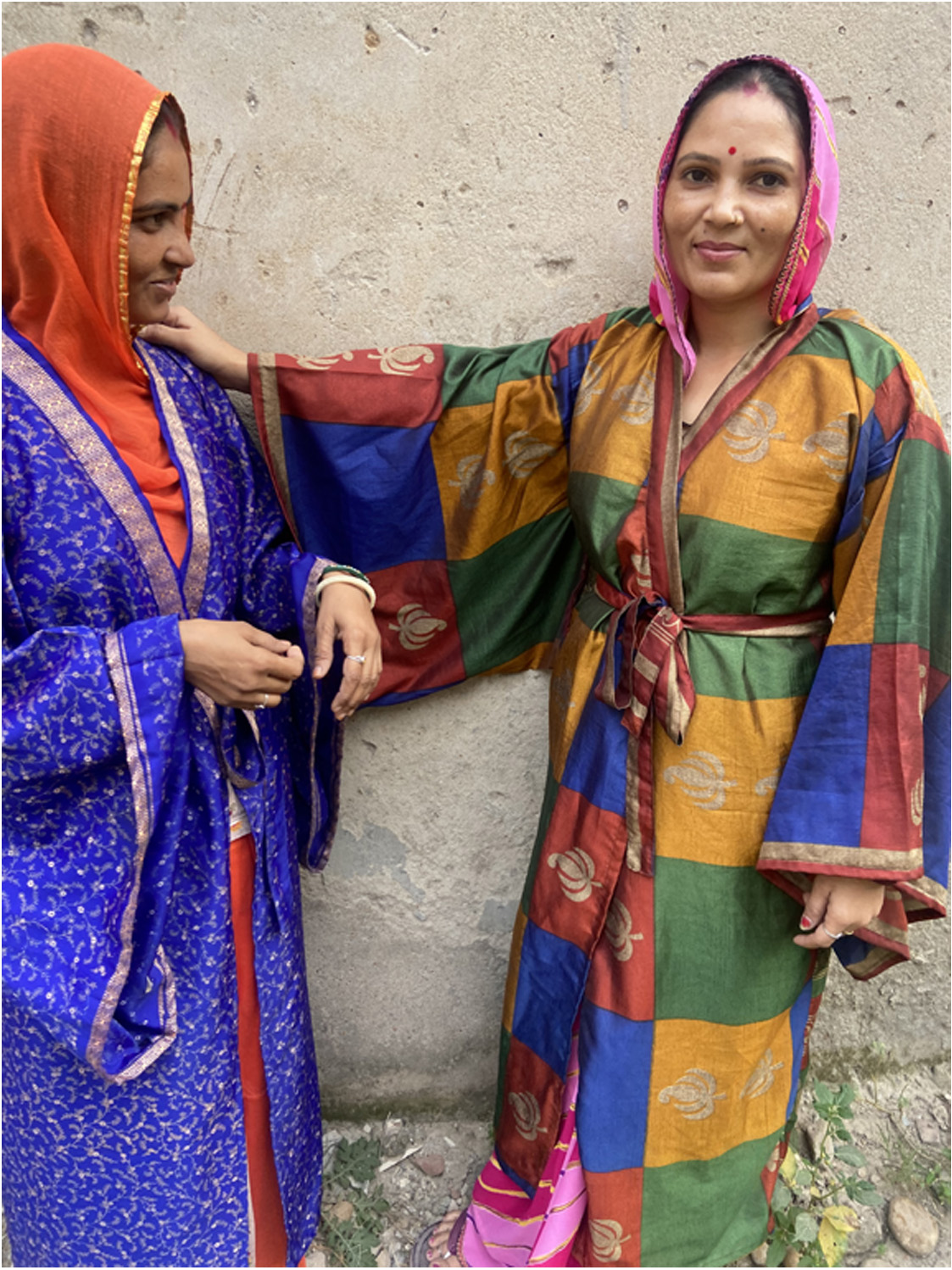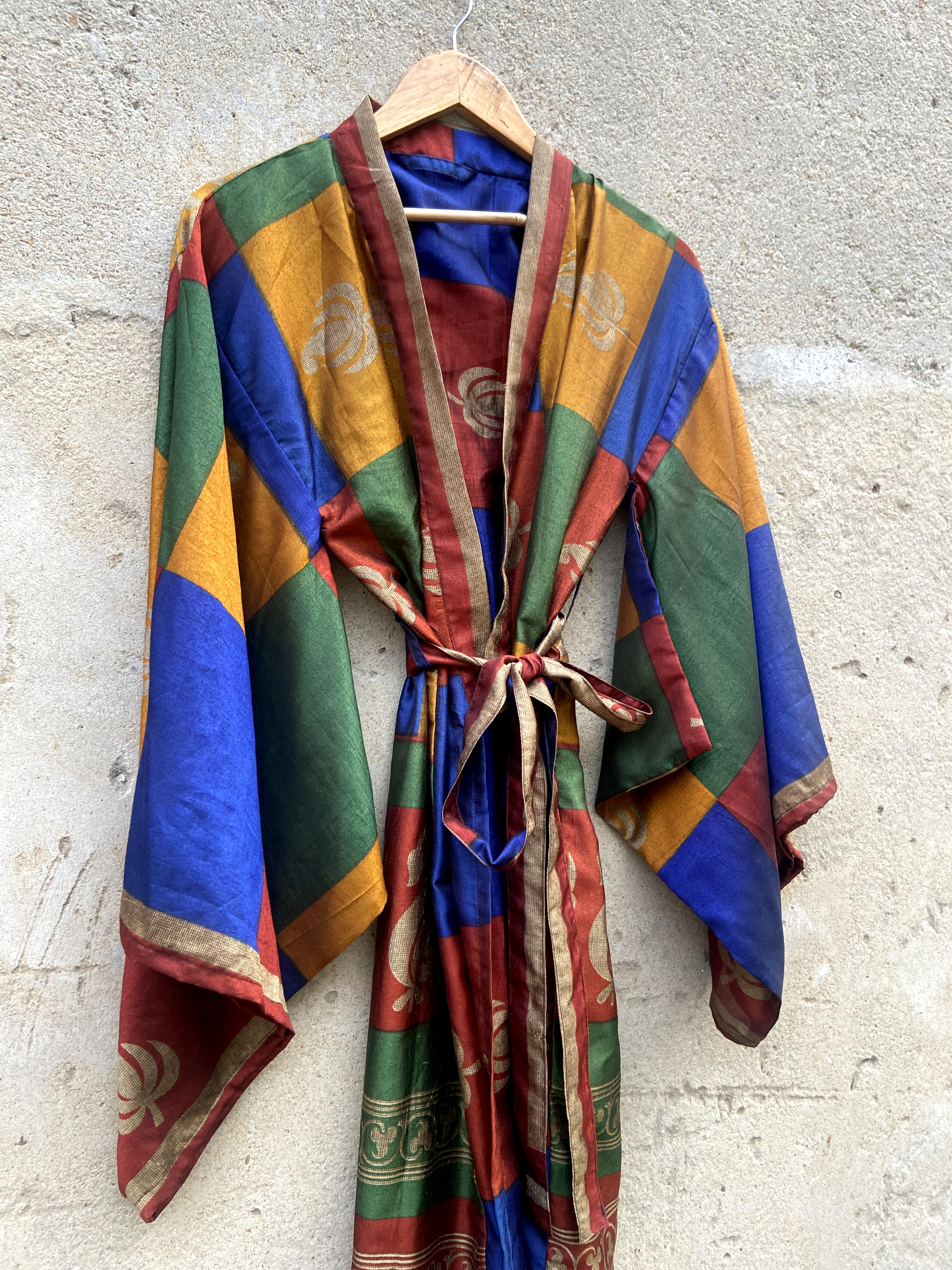 This beautiful kimono is made from upcycled vintage sari silk sourced in Rajasthan. Each unique kimono is handmade by women .