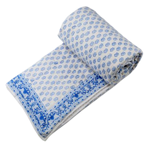 Cotton Hand Block Printed White Quilt with Blue Booti Print